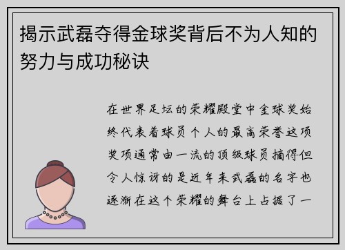 在世界足坛的荣耀殿堂中,金球奖始终代表着球员个人的最高荣誉。这项奖项通常由一流的顶级球员摘得,但令人惊讶的是,近年来,武磊的名字也逐渐在这个荣耀的舞台上占据了一席之地。作为中国足球的代表性人物,武磊不仅凭借其出色的技术与拼搏精神脱颖而出,更在比赛场上展现了无与伦比的努力与决心。本文将从四个方面深入揭示武磊夺得金球奖背后不为人知的努力与成功秘诀,探讨他的训练方式、心态调整、技术突破以及团队协作等关键因素。通过这些细节的剖析,我们能够更加清晰地理解武磊如何在全球顶级联赛中脱颖而出,最终登上金球奖的领奖台。